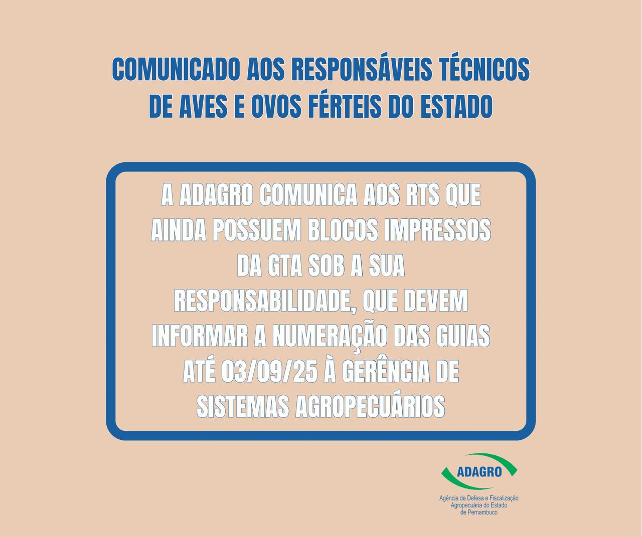 COMUNICADO DA GERÊNCIA ESTADUAL DE TRÂNSITO AGROPECUÁRIO – GETA AOS RESPONSÁVEIS TÉCNICOS PELA EMISSÃO DA GUIA DE TRÂNSITO ANIMAL – GTA DE AVES E OVOS FÉRTEIS A Gerência Estadual de Trânsito Agropecuário (GETA) emitiu comun...