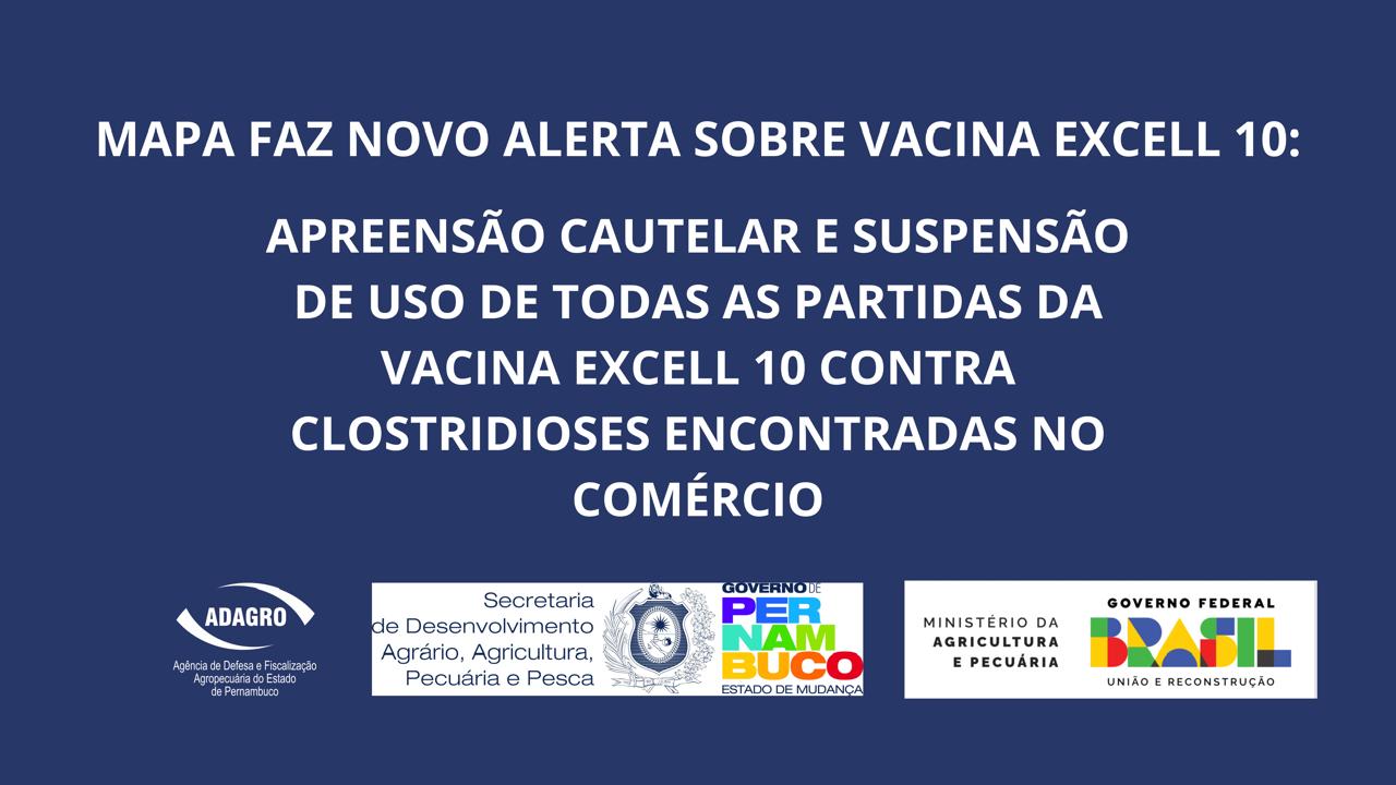 Ministério da Agricultura e Pecuária (MAPA) emitiu um novo comunicado a respeito da vacina Excell 10, contra clostridioses A Agência de Defesa e Fiscalização Agropecuária do Estado de Pernambuco – Adagro informa que, após suspend...