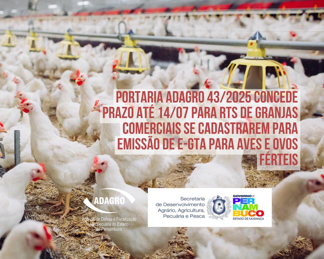 A data final para emissão de GTA manual no estado é 14 de julho e a partir de 15/07 a Guia de Trânsito Animal eletrônica (e-GTA) de aves e avos férteis torna-se obrigatória em Pernambuco A Portaria nº 43/2025 da Agência de Defesa ...